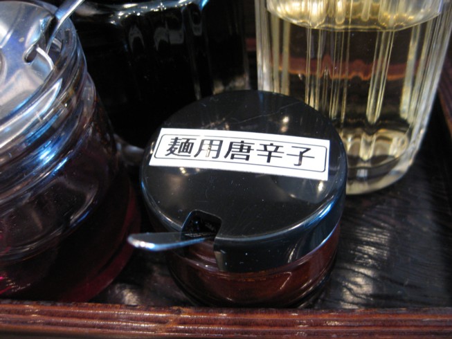 残りわずかになった所で、テーブルにある 麺用唐辛子を投入、ピリ辛にして完食!