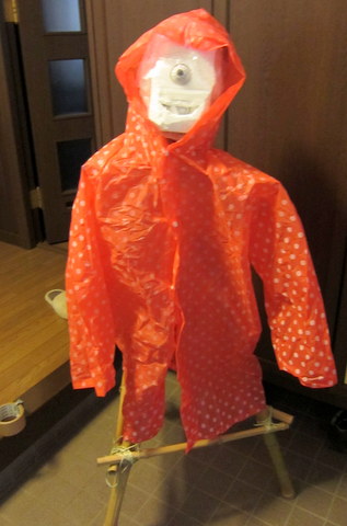 レインコートのお化けは、乾電池式のLEDセンサーライトを使い、