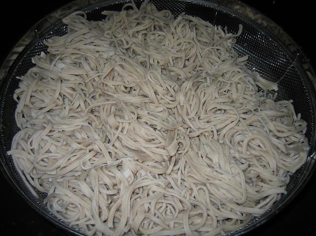 打ち粉をして、そばをほぐして、大鍋で茹でてもらいます。 ザルに上げて