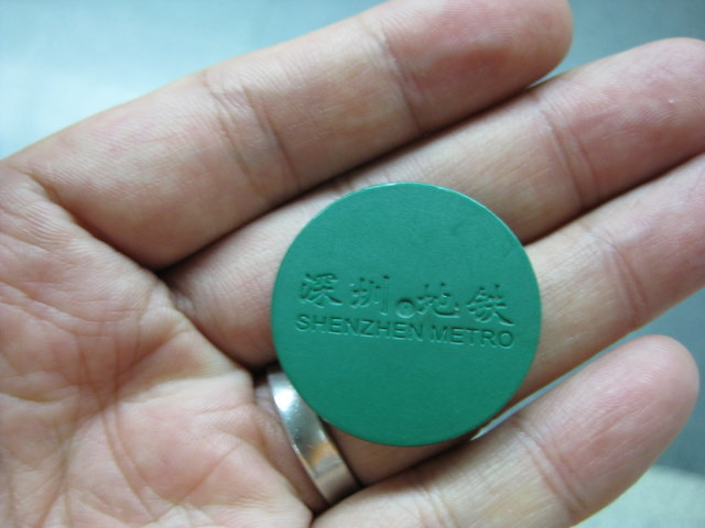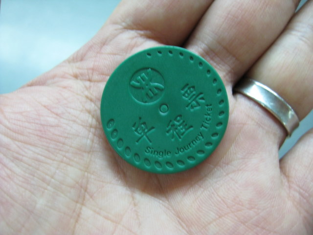 プラスチックコインは、入るときは SUICAみたくタッチ、降りるときは 改札回収口へ投入。