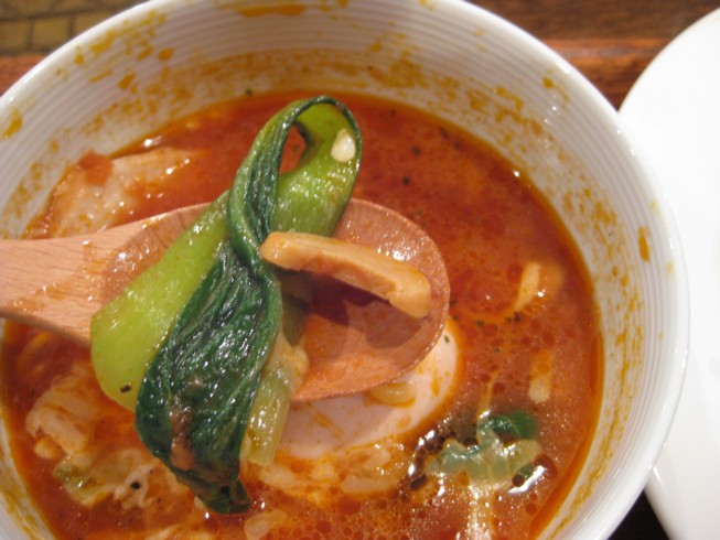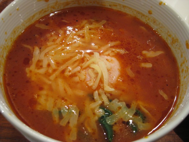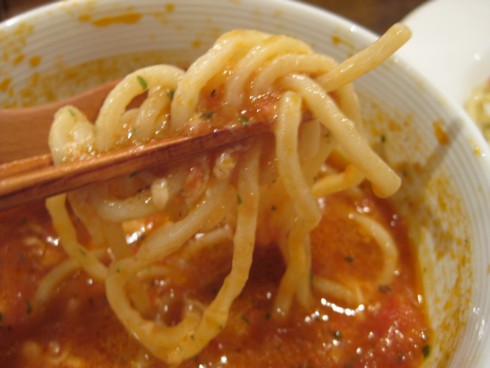 トマト色の真っ赤な つけ汁は ミネストローネを濃くした感じでトマトの酸味が効いています。