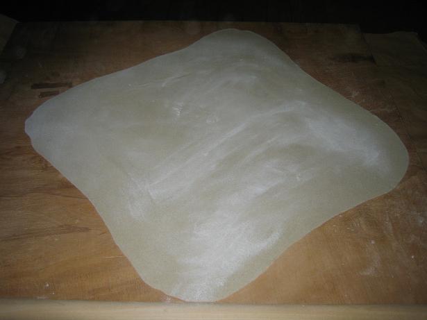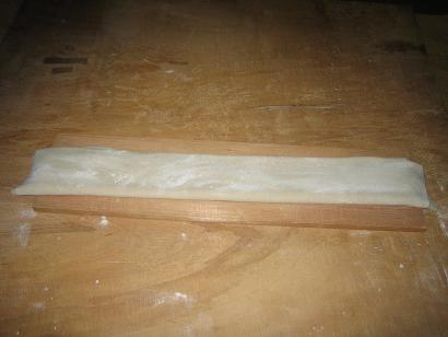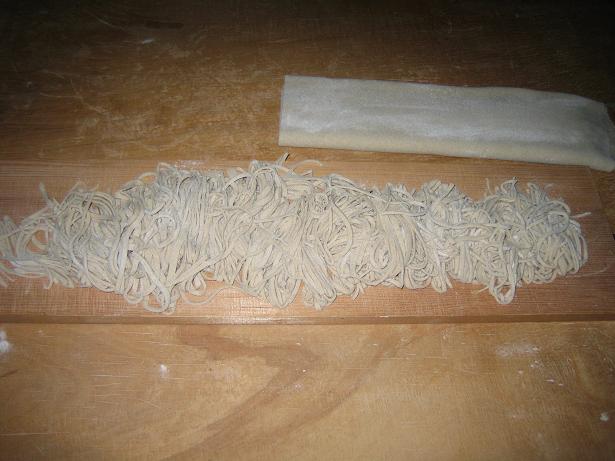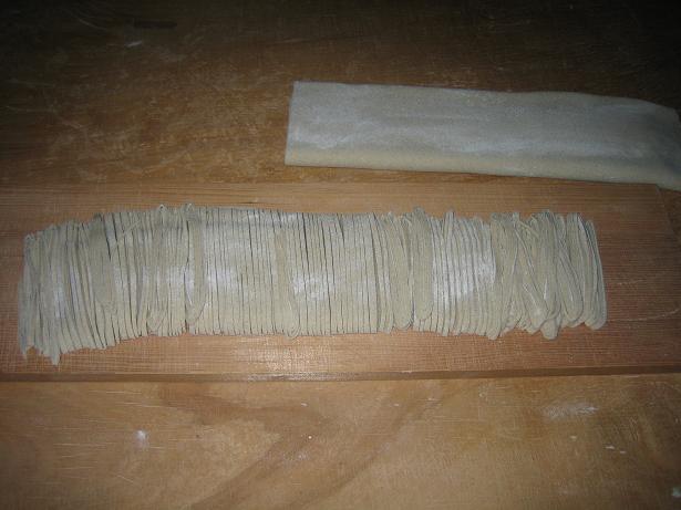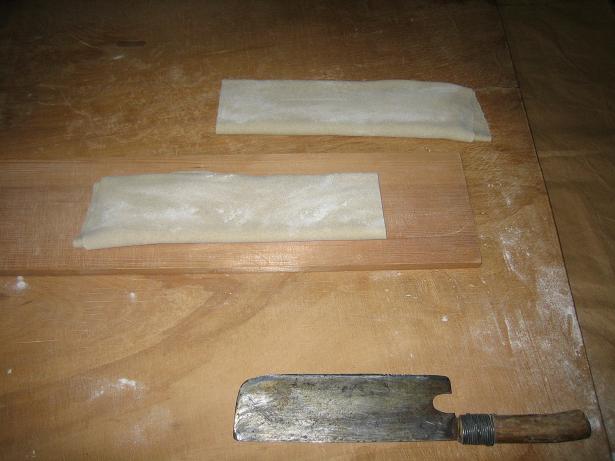 伸ばしたら、畳んで、 この包丁で切ります。多少繋がっていましたが、ご愛嬌ということで・・・。