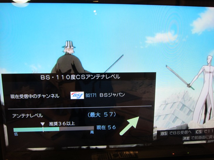 試しに、TVでBSのチャンネルを見てみると、微調整なしで見えてる!