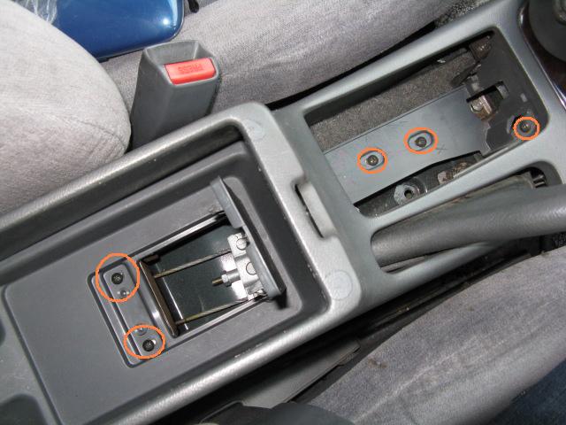 | ドリンクホルダーを取って ネジを5本外して サイドブレーキまわりの カバーを外す。 |