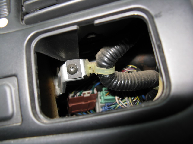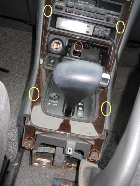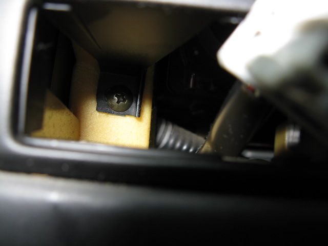 ATシフトレバー手前の ネジ2本と 灰皿奥のネジ1本を外し ウッド調パネルを外す。 |