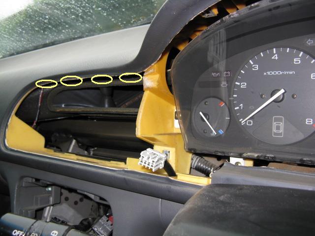 リアガラスの熱線SW、コネクタを外し、中のビスを外す。 | 運転席右側の エアコン噴出口下側にある ビスも外す。 |